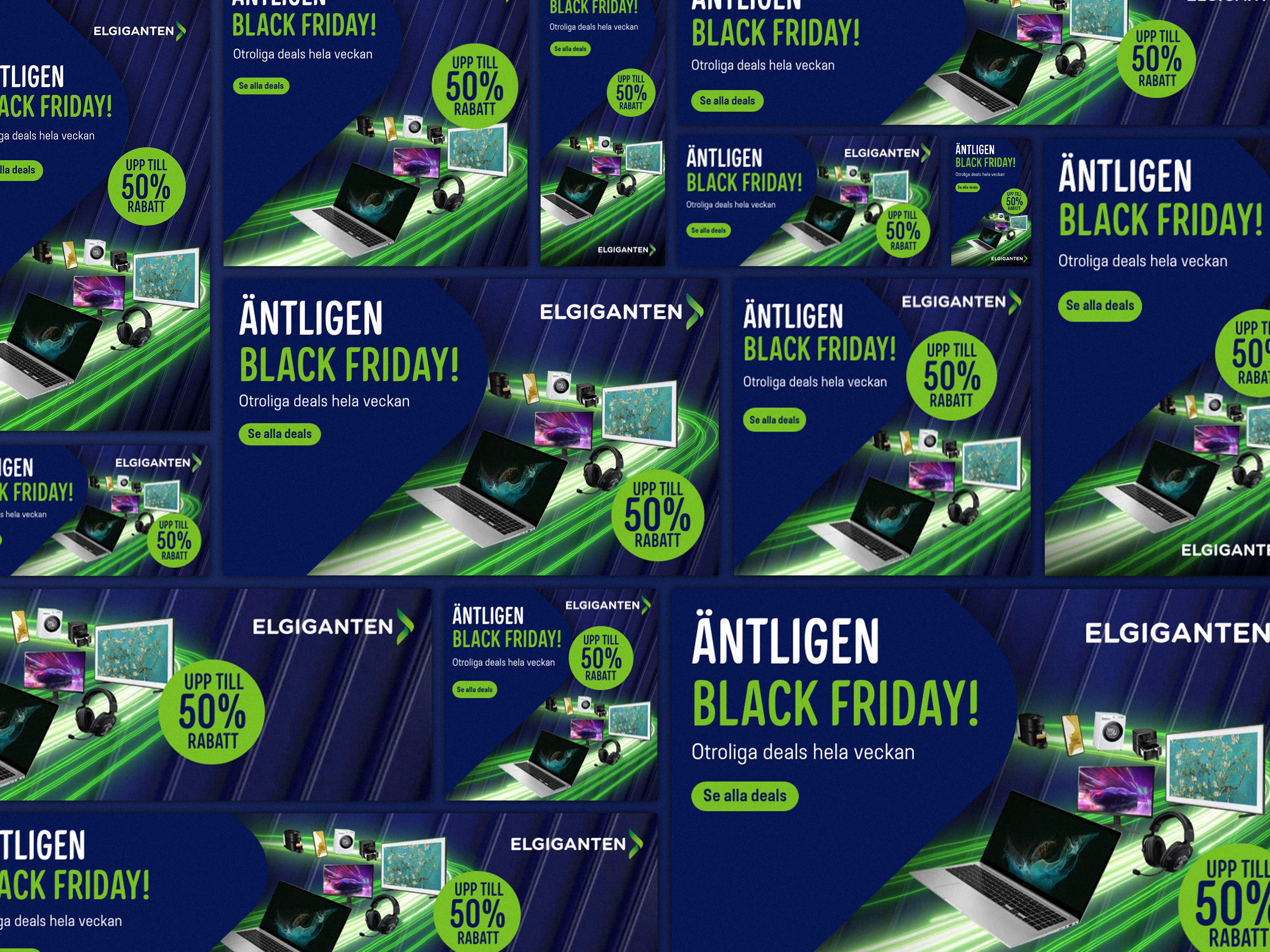 Together with a large team at Publicis Leo, I've been responsible for building and maintaining Elkjøp's identity. Between 2021 and 2025, I've created several campaign toolboxes together with other designers on the team, as well as being responsible for a large portion of the production of tactical display banners. I've also been responsible for creating templates for automated banners within Elkjøp's banner production solution, Bannerflow. In this example from 2022 and 2023, we built a 3D animated world to accompany the products Elkjøp would go on to advertise during Black Week. I did the 3D animation together with another motion designer, as well as the compositing, the sound design, and the production of the campaign's display banners.